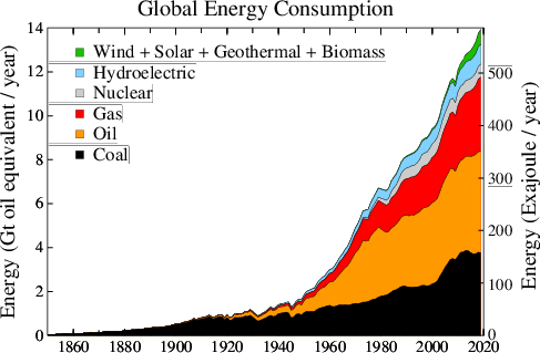 Seeing on the GFN timeline chart how large a role “Carbon” (the blue area) plays in overshoot, a not-fully-informed, “green” technology optimist might speedily conclude that all we need to do is switch from fossil fuel burning energy use to electric energy devices, in order to live regeneratively, in synch with our one Earth. What is generally overlooked or intentionally ignored by such simplistic, wishful thinking is how much fossil fuel-powered industrial equipment is currently necessary and preferred by industrial capitalists (mainly for competitive reasons) in order to mine the materials, conduct the manufacturing, transport, install, and maintain the enormous “green” energy infrastructure that would be necessary to continue with our unsustainable, over-consumptive, and ever-growing “needs.” Nearly all of the factors contributing to overshoot have been made possible by the enormous industrial, economic and technological infrastructure that has been powered increasingly by fossil fuels over the last 250 years, as William Catton details in his books and we shall discuss further, below. There is a considerable amount of human impact on Earth’s life-giving systems that is not mentioned or accounted for in this chart, like impacts from mining, pollution of surface water sources, and the drawdown of underground aquifers, just to name a few. If those and many other anthropogenic (human-caused) impacts were included in the chart, the blue “Carbon” area would make up a much smaller proportion of the whole, and thereby provide us with a more accurate picture of the causes of ecological overshoot.